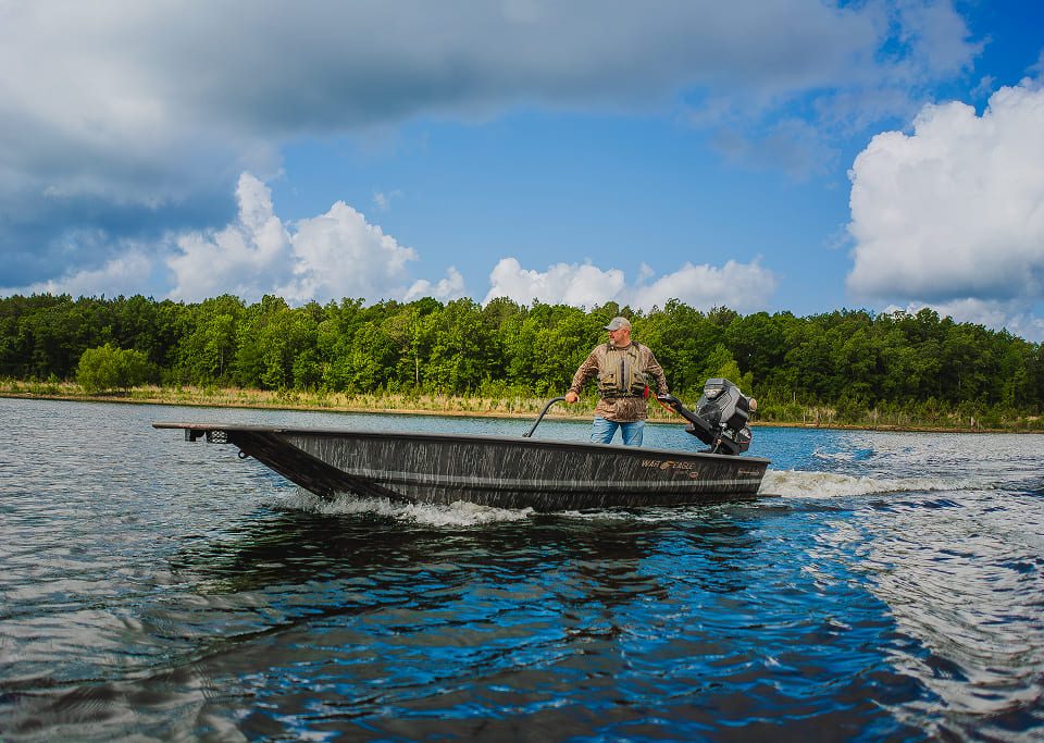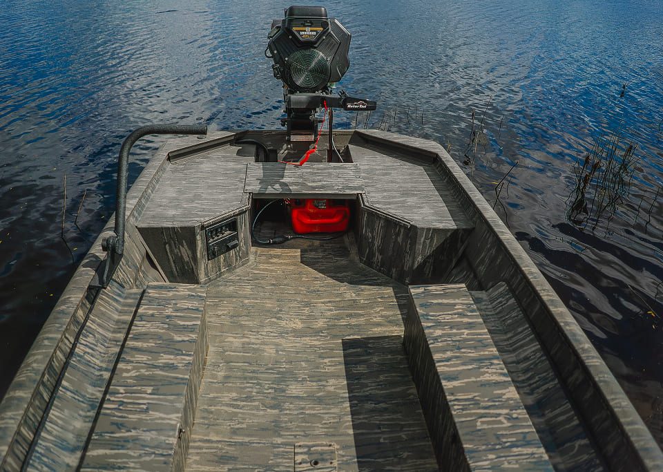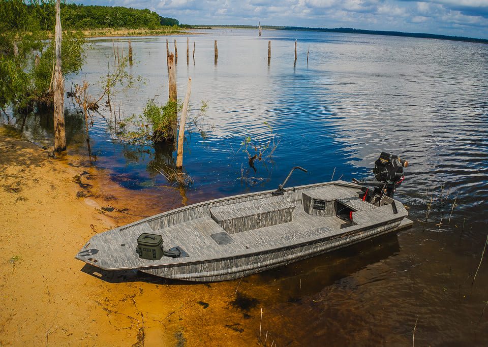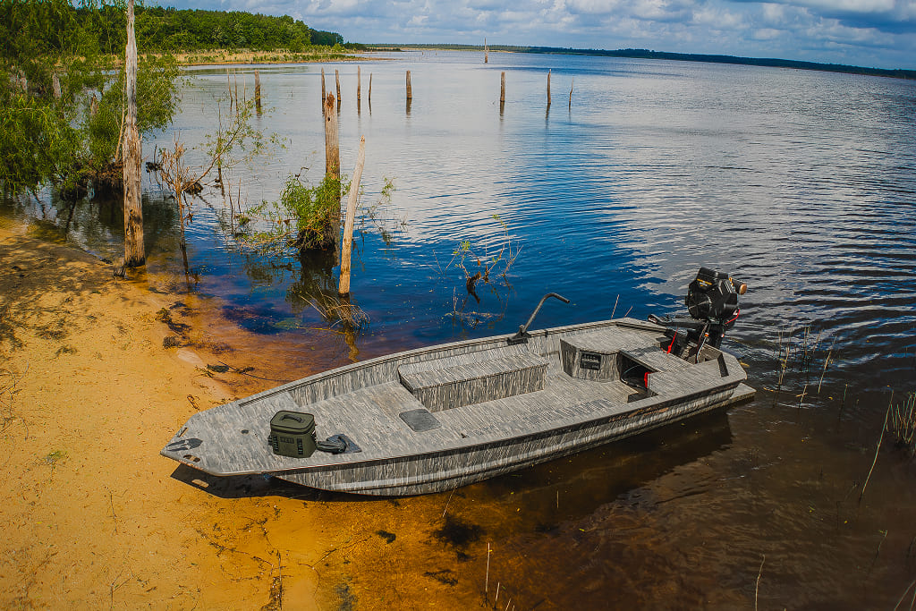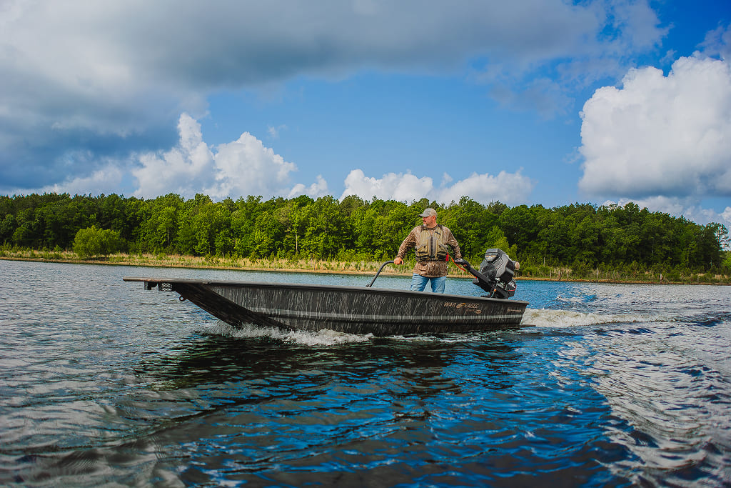 Introducing the new shallow draft mud boat from War Eagle Boats. The gladiator is made for getting you to that perfect duck hole with an extended duckbill bow to part brush and deflect water. It is also available in a BANDED edition, as shown above.